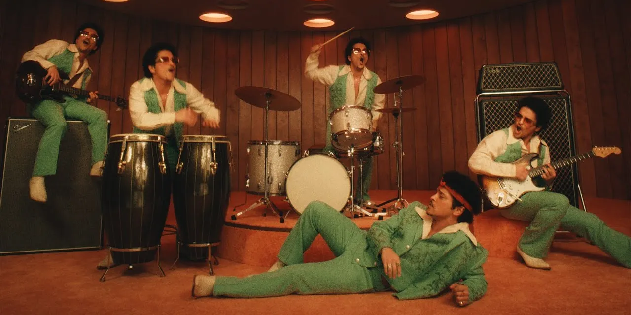 Accompanying the single is a vibrant official music video co-directed by Bruno Mars and Daniel Ramos. Set on a retro, 1970s-inspired soundstage, the video features Mars performing alongside multiple versions of himself — portraying everything from lead singer to instrumentalists — under colorful lights and in a sharp green suit. The visuals emphasize his showmanship and playful personality, reinforcing the feel-good mood of the song.